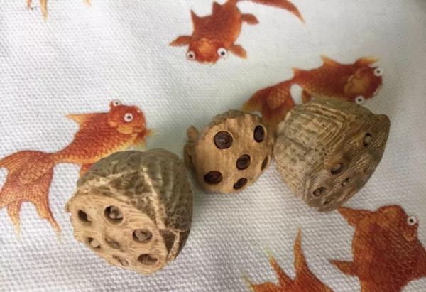 由此又找出数年前淘得的珍珠蜜莲花吊坠一枚,鸡油黄蜜蜡莲蓬吊坠一枚,疑似黄杨木雕的莲蓬三枚。