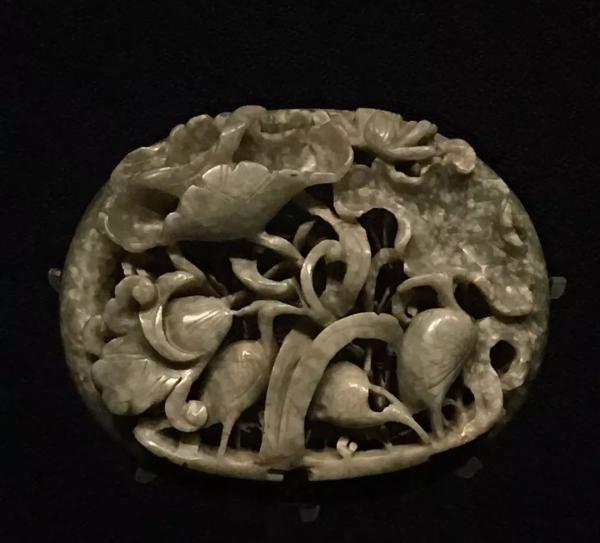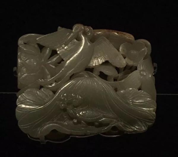 相形之下,另一件元代的莲鹭纹饰就“粗”了些,玉花斑驳细节随意,但定睛看,荷叶翻卷舒展,三只鹭鸶或前视或低头啄食或回首彼此呼应,又与茎叶穿插掩映偃仰有姿。