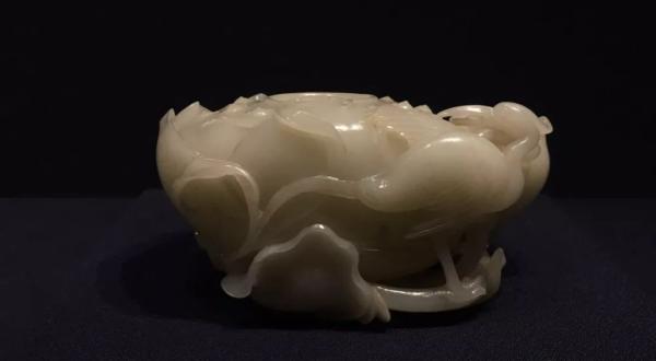 又清代的莲鹭水盂,整料饱满,青白温润,立体圆雕,构思极巧,一只鹭鸶站立茎梗之上,回首探视一大朵开到极盛的荷花,莲房已现,中空莲蓬恰好用来盛放清水,供笔墨怡情。