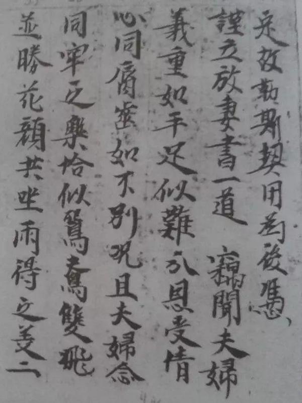某李甲谨立放妻书。盖说夫妇之缘,恩深义重,论谈共被之因,结誓幽远。凡为夫妇之因,前世三生结缘,始配今生夫妇,若结缘不合,比是怨家,故来相对。妻则一言十口,夫则反目生嫌,似稻鼠相憎,如狼羊一处。既以二心不同,难归一意,快会及诸亲,各还本道。愿妻娘子相离之后,重梳蝉鬓,美裙娥眉,巧逞窈窕之姿,选聘高官之主。解怨释结,更莫相憎。一别两宽,各生欢喜。