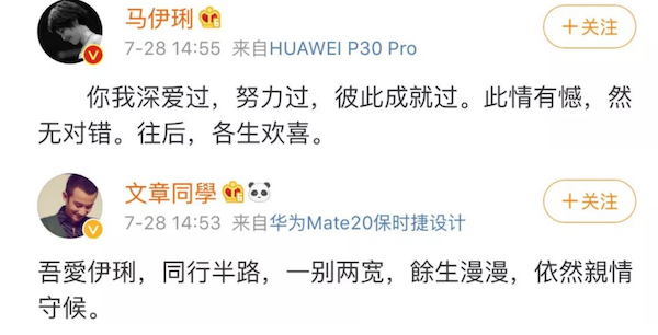7月28日,演员文章、马伊琍通过微博宣布离婚。