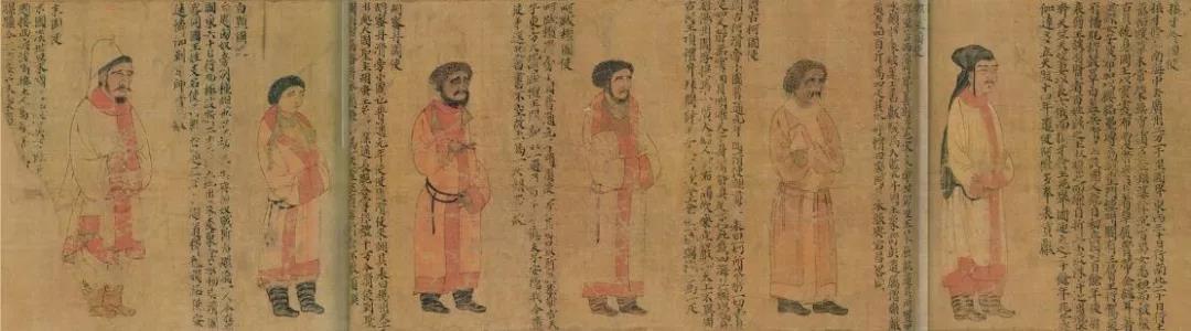 梁元帝萧绎所作《职贡图》是现存最早的“职贡”图像,图中描绘了滑国、波斯、百济、龟兹、倭国等使节12人,每个使者身后还有一段该国的国情记载。