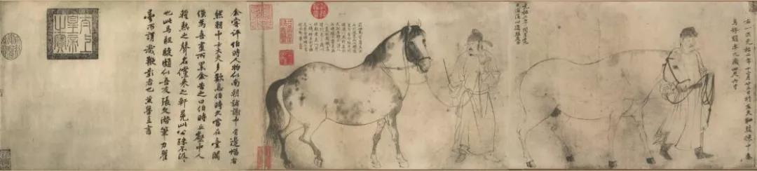 根据黄庭坚的题笺以及南宋周密《云烟过眼录》记载,上述5匹骏马从右至左分别是:元祐元年(1086年)十二月十六日,西域于阗国进贡的凤头骢;元祐元年四月初三日,青唐部首领董毡进贡的锦膊骢;元祐二年十二月二十三日,北宋禁军拣中进奉的秦马好头赤;元祐三年正月上元日,于阗国进贡的满川花;元祐三年闰月十九日,吐蕃羌部首领温溪心进贡的照夜白。画中5位奚官,后两人为汉人打扮,前三人为异族装束,3位异族贡使或高鼻深目、虬髯满腮,或头戴毡帽,半裸衣袍,画面定格的一瞬间似正在牵马训导。整幅造型准确生动,构图别开生面,为我们展现了北宋王朝与西域等地朝贡往来的历史图景。