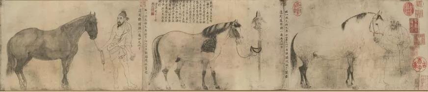 北宋李公麟的《五马图》也属于“职贡图”一类的绘画,画面表现为西域各国向北宋朝廷进贡名马的情景。此画为长卷,分5段,每段一人牵一马,马取侧面之势,劲健强壮,皆是西域雄马,分属于北宋皇家马厩——左麒麟院和左天驷监。每匹马左侧有题笺,分别说明马的年岁、尺寸、进贡者和年月等。