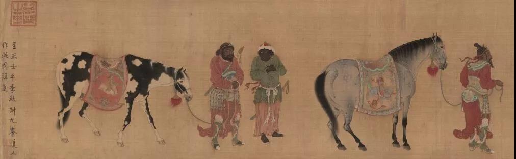《三骏图》共绘有六人三马,横向作一字排列,六人当为拂郎国使节,中西服饰混穿,分别作控马、举剑、执旗状,旗上还绣有“进贡”两字。史料记载,这些拂郎国使节“黄须碧眼,服二色窄衣,言语不可通,以意谕之,凡七度海洋,始达中国”。该图描绘了“拂郎国献异马”这一元代宫廷重要外交活动,是一件兼具艺术价值与史料价值、极其珍贵的“职贡图”。