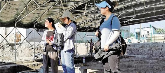 记者与朱叶菲(左1)在考古工地。