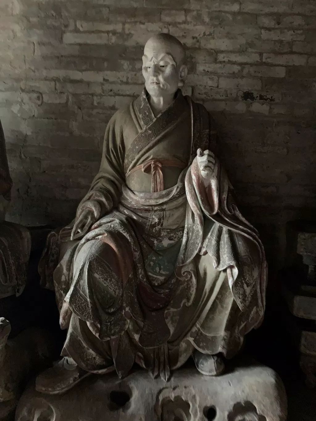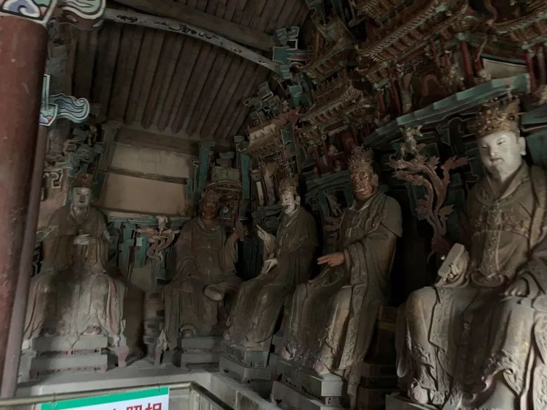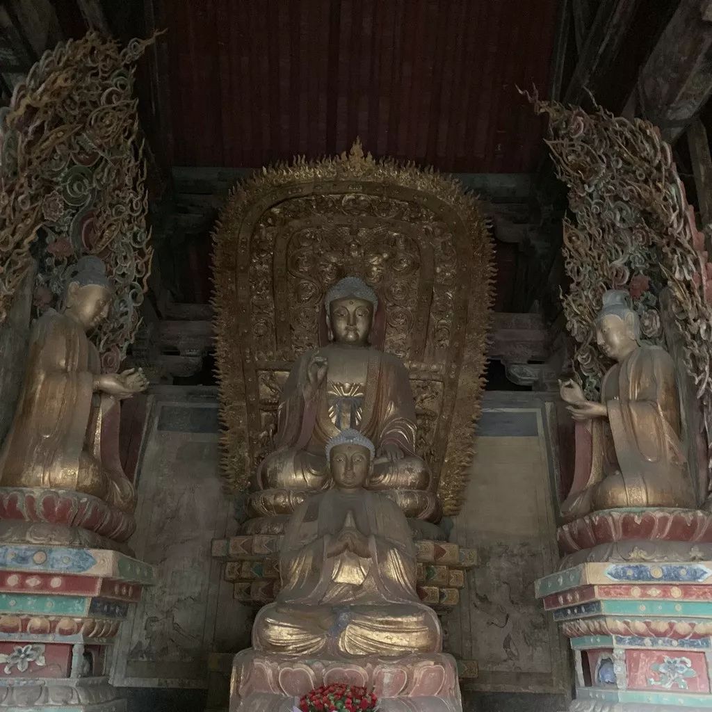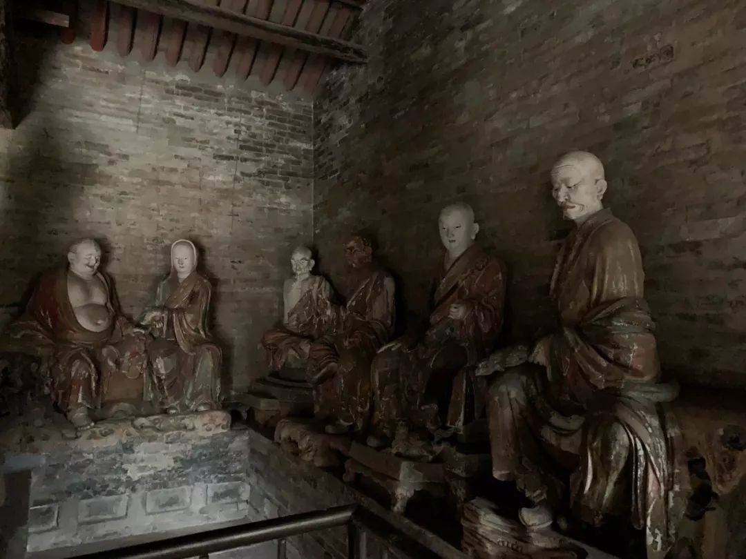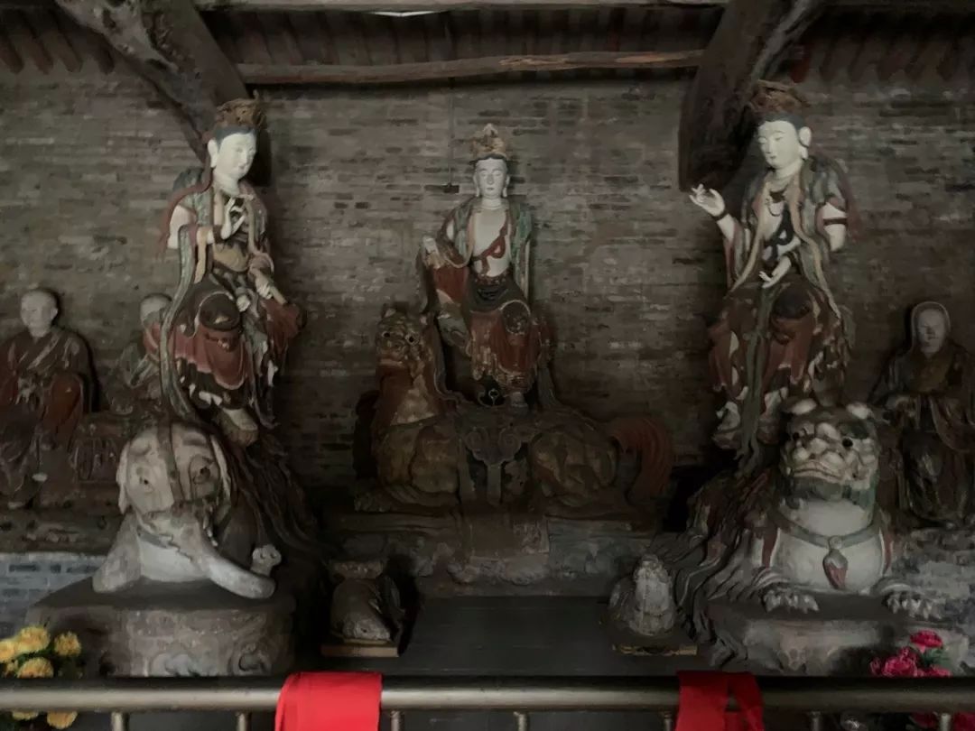 三大士殿,俗称西配殿,也叫罗汉殿,西阔三间,悬山式顶,虽经后人修葺,外观已为清式风格,而殿内梁、枋、柱、额几乎全是宋代原物。殿内佛台较低,上塑观音、文殊、普贤三尊菩萨,菩萨像两侧为十八罗汉,大小比例与真人略同,肌肉丰润,骨骼健壮,衣褶婉转流畅,神态生动自然,与俊秀而清逸的菩萨聚集一堂,刚柔相济,风格迥异。佛坛前沿砖雕束腰处,留有两方刻字,铭记着造像年代及布施者姓名,证实了塑像制作的确切年代,历经九百多年,保存完好,这在我国佛教文化发展史和雕塑史上,确为难得的珍品。