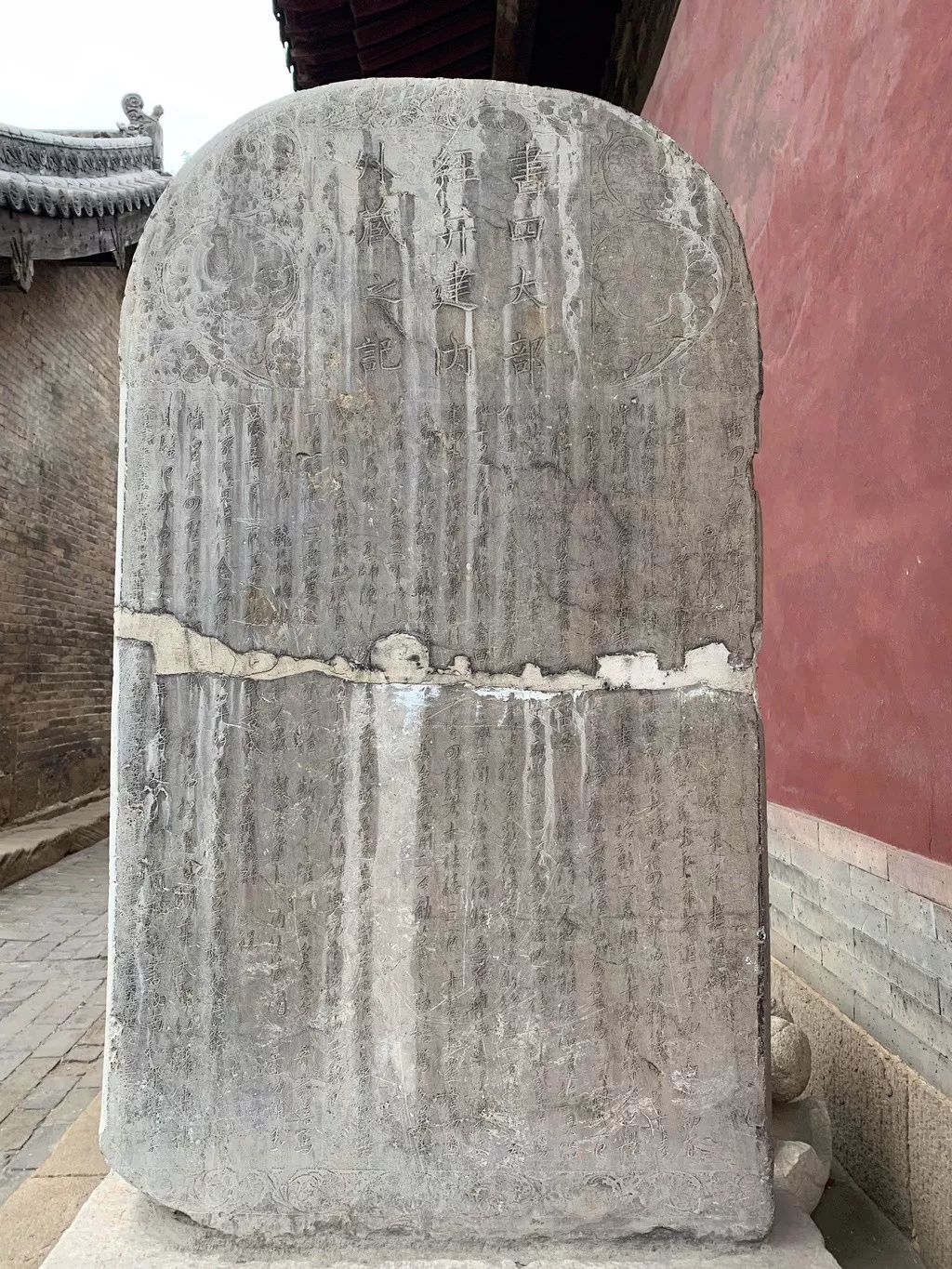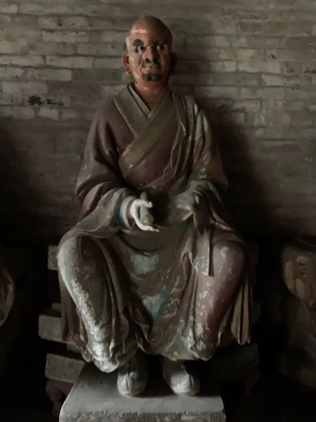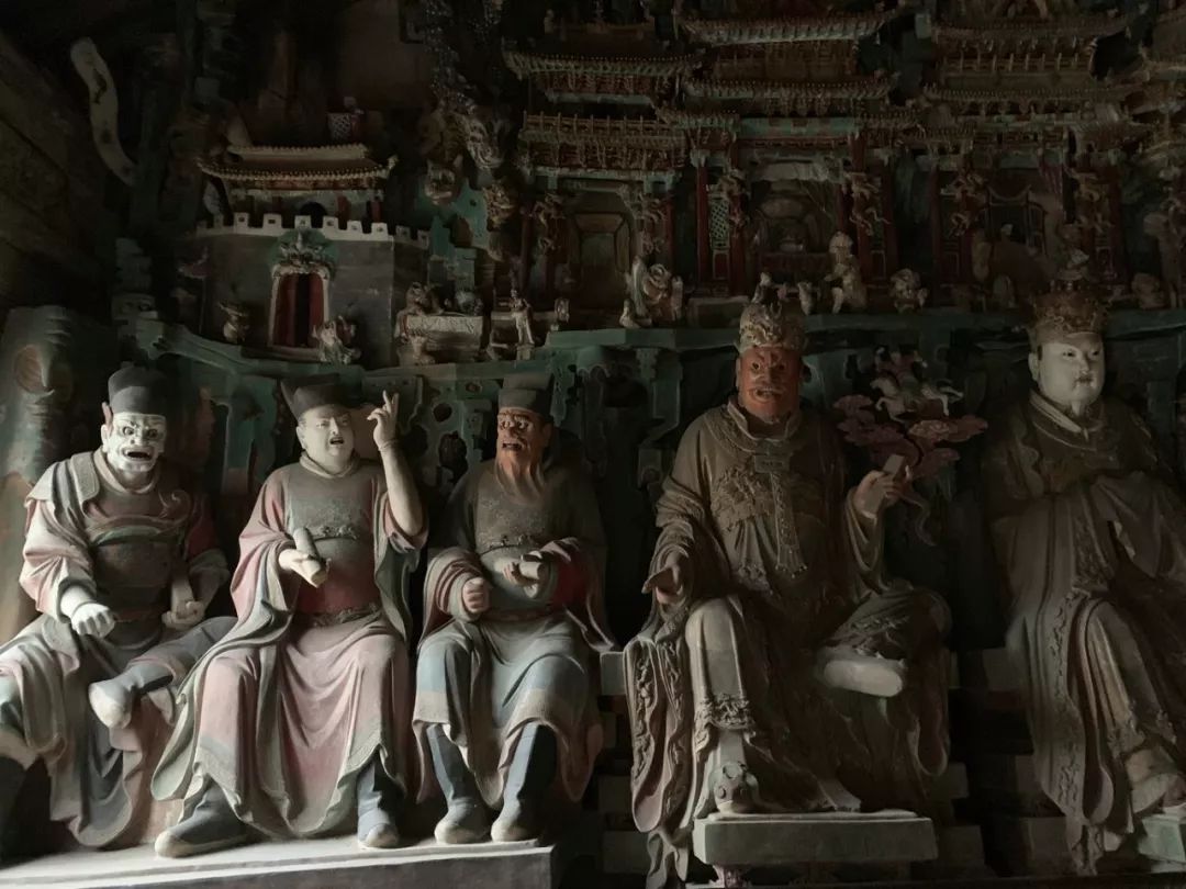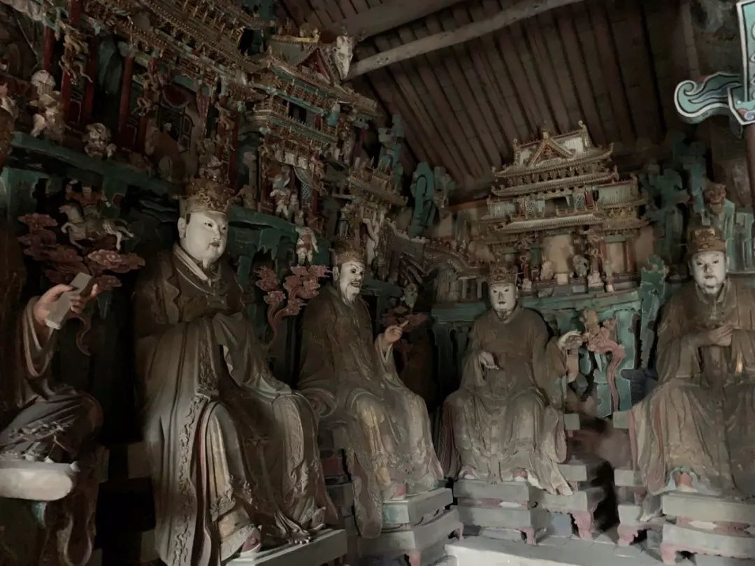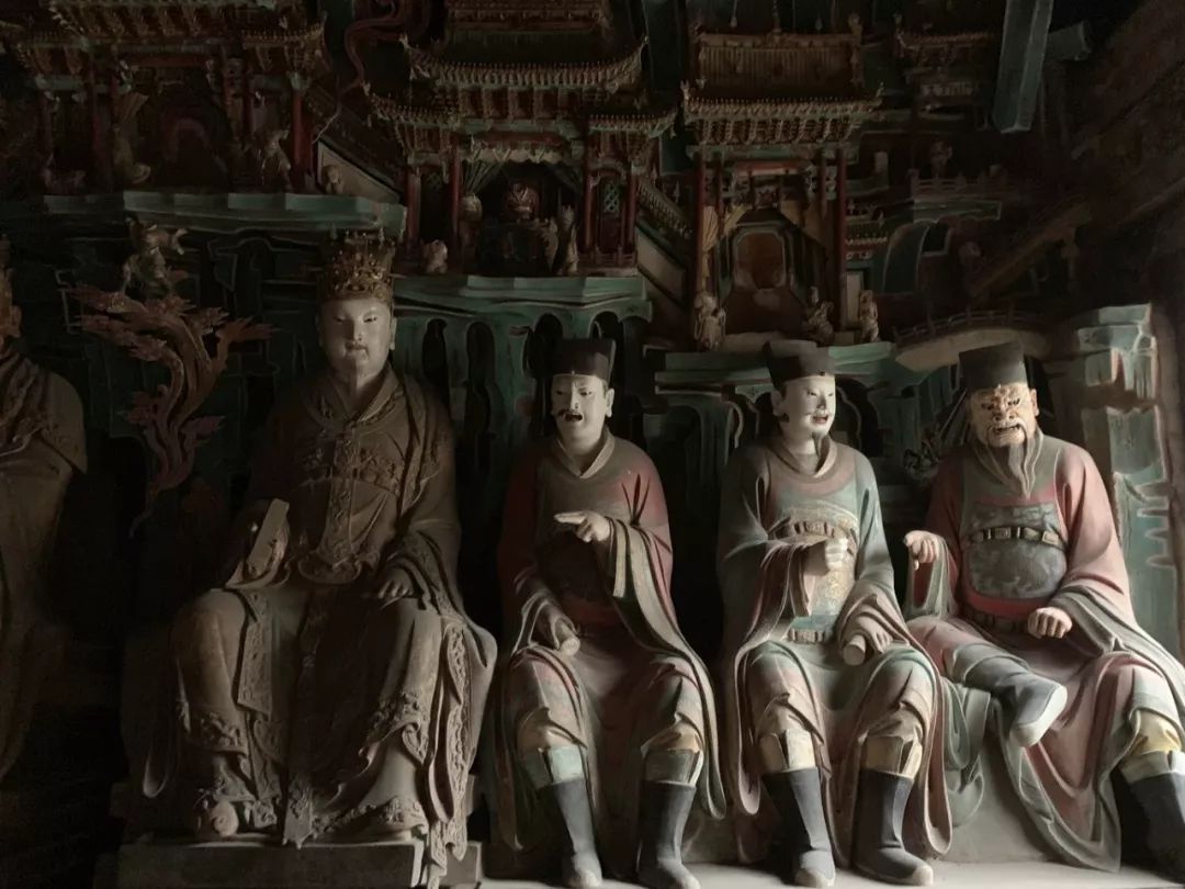 三大士殿,俗称西配殿,也叫罗汉殿,西阔三间,悬山式顶,虽经后人修葺,外观已为清式风格,而殿内梁、枋、柱、额几乎全是宋代原物。殿内佛台较低,上塑观音、文殊、普贤三尊菩萨,菩萨像两侧为十八罗汉,大小比例与真人略同,肌肉丰润,骨骼健壮,衣褶婉转流畅,神态生动自然,与俊秀而清逸的菩萨聚集一堂,刚柔相济,风格迥异。佛坛前沿砖雕束腰处,留有两方刻字,铭记着造像年代及布施者姓名,证实了塑像制作的确切年代,历经九百多年,保存完好,这在我国佛教文化发展史和雕塑史上,确为难得的珍品。