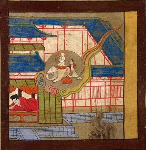 因此,莲花在随之而来的重要场景“佛陀的诞生”中,以一种飞跃形式进入母亲的子宫,这并不让人感到吃惊。佛本生故事就有释迦牟尼前生投胎为王子,成为莲花王子,登基后称莲花王;而可爱的婴儿则有“莲花瓣一样的儿子”这样的赞美。“莲花瓣一样的儿子”既可形容出生时的释迦摩尼,又预言了未来的哪吒。在这种情形下,哪吒莲花化身的故事也就喷薄欲出,万事俱备,只欠中国的土壤了。