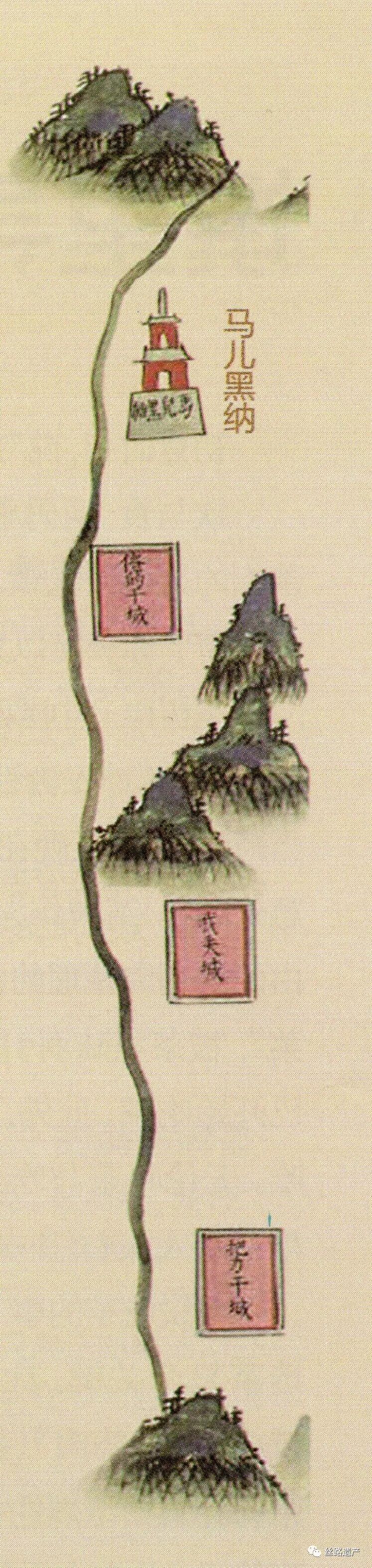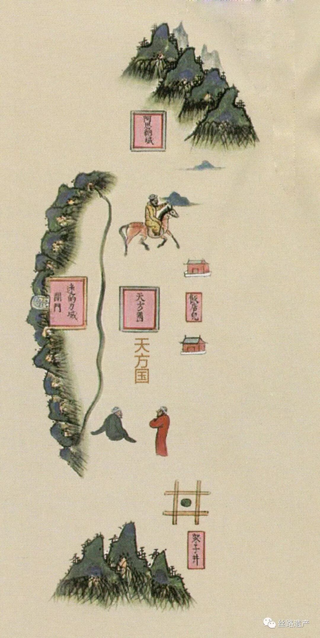 图中丝绸之路沿线聚落的相对位置,与实际情况基本符合,在古代中国的域外地图中十分难得。不过若仔细观察图中的建筑形式,却有些令人疑惑。比如图中有大量类似于庑殿顶式的建筑符号,这显然是汉地的建筑。《蒙古山水地图》上更为突出,其对城池、关隘的表现,完全是中国式的。