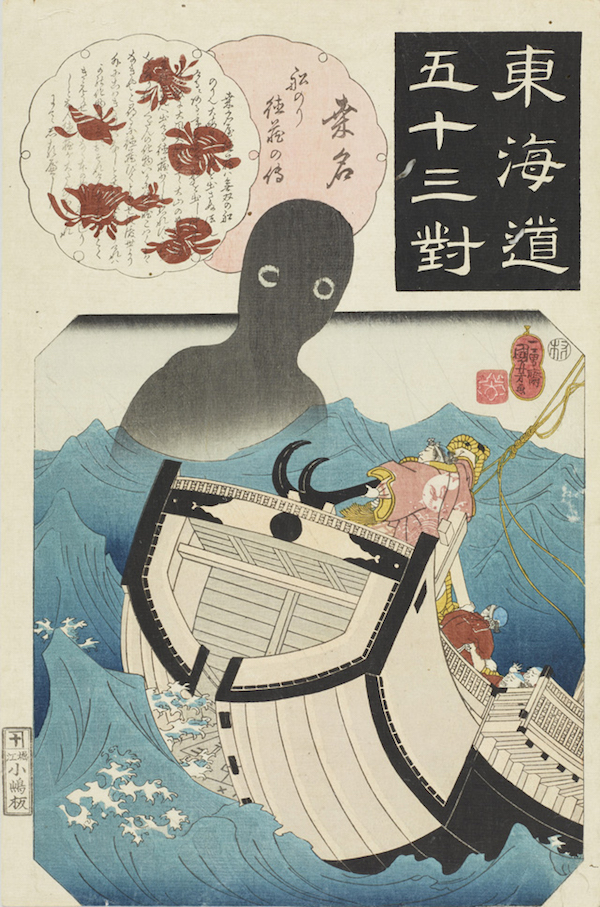 在此次日本东京太田纪念美术馆的展览中,一幅歌川国芳的《东海道五十三对》之《舵手桑名屋德藏传》讲述了水手桑名屋德藏遇见“海坊主”,海坊主问他是否害怕自己。但舵手却说自己更害怕这个世界。在日本的传说中,海坊主会在暴风雨或是傍晚时出现于海面上,是渔夫们在海上作业时最怕碰到的妖怪。