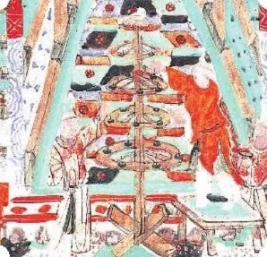 其实,在隋文帝时期,正月十五就已经热闹繁盛得很了。开皇年间,一个叫柳彧的官员曾经上书说,都城和其他一些地方,每到正月十五夜,就会“充街塞陌,聚戏朋游,鸣鼓聒天,燎炬照地,人戴兽面,男为女服,倡优杂技,诡状异形”,一片狂欢景象。这份奏折原意是批评正月望夜的浪费资财、伤风败俗,却留下了当年元宵节盛极一时的确凿证据。在隋朝,元宵节不仅有大型的歌舞、百戏、夜游等活动,张灯的做法也出现了。隋炀帝有《正月十五日于通衢建灯夜升南楼》诗:“法轮天上转,梵声天上来。灯树千光照,花焰七枝开”,可以为证。