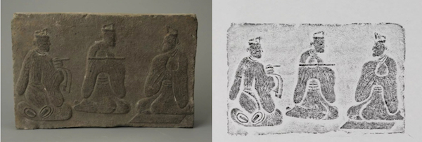 画中有三人,头上皆戴冠身着宽袖长袍,腰间束带,右边一人侧身向左,左边二人面向右手捧竹简正在讲经。