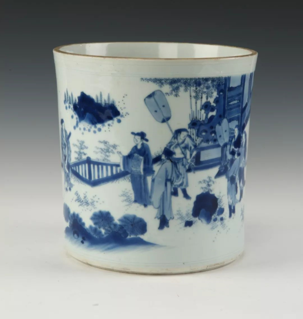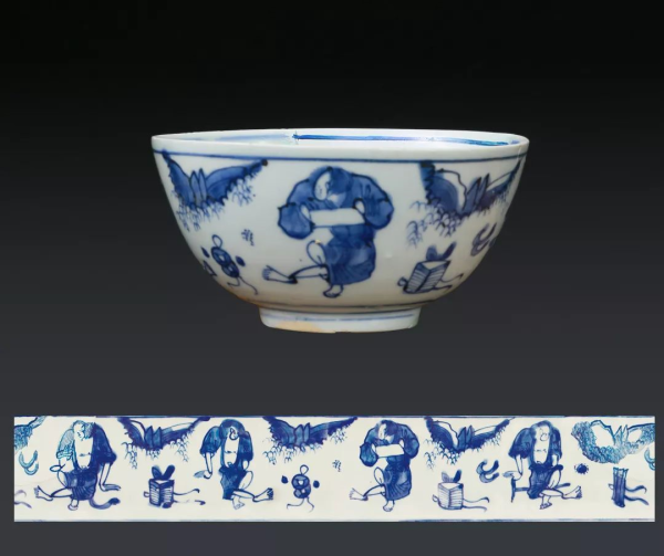 人物典故图案纹饰是明代青花瓷器装饰最多、传统文化内涵最丰富的一类。绘画风格生动豪放、富于画意,线条舒展流畅。题材多取自于戏曲、民间故事传说、小说话本等,以宣传忠孝仁义等思想为主,具有其积极意义的一面,如三元及第、状元游街、西厢记、梅妻鹤子、萧何月下追韩信、洪森住店、三茅真君等;也有反映生产生活、文化艺术方面的内容,如农耕图、寒山拾得等。明代所画的人物比较挺拔,小孩儿头比较肥大,不合比例,前额及后脑凸出;多采用平涂绘画法,有成化人物“成窑一件衣”之说。
