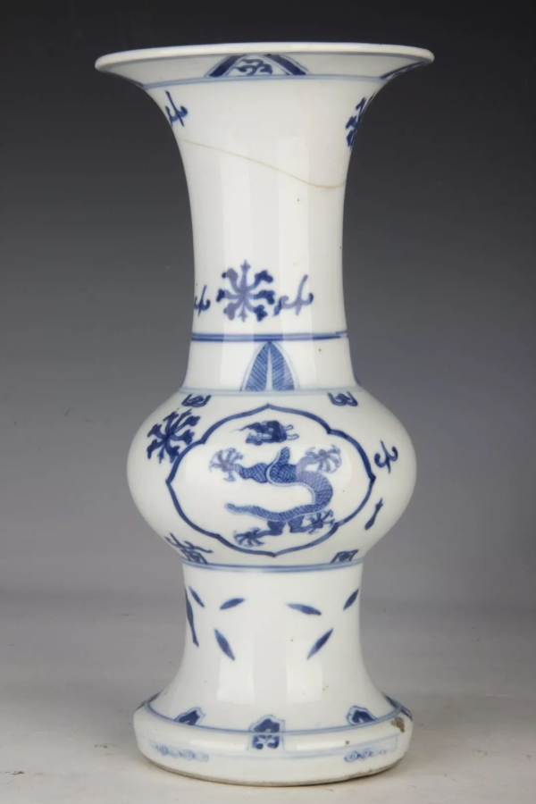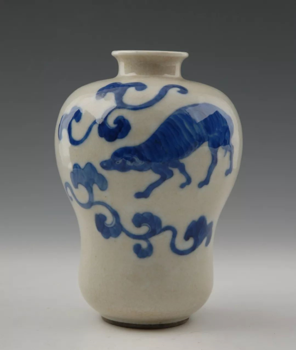 瑞兽是原始人群对于保护神的一种图腾崇拜,是人类历史上最早的一种文化现象。中国古代神话传说中有青龙、白虎、朱雀、玄武等四大瑞兽,另外还有麒麟、凤凰、貔貅、仙鹤等瑞兽。明代青花瓷常见瑞兽纹饰有团龙、云龙、双龙、五龙、龙凤、云凤、狮子舞绣球、麒麟、仙鹤等。早期龙鳞画得精细,晚期龙鳞画得草率,龙爪画得简单,但雄壮有力。龙身窄瘦、龙咀较长,一般称之为猪咀龙。八宝纹的排列多为轮、螺、伞、盖、花、鱼、罐、肠。嘉靖时期,由于皇帝喜好黄老之道,道教内容图案(如八仙、八宝、八卦、云鹤等)增多,吉祥图案增多,纹饰趋于繁缛。