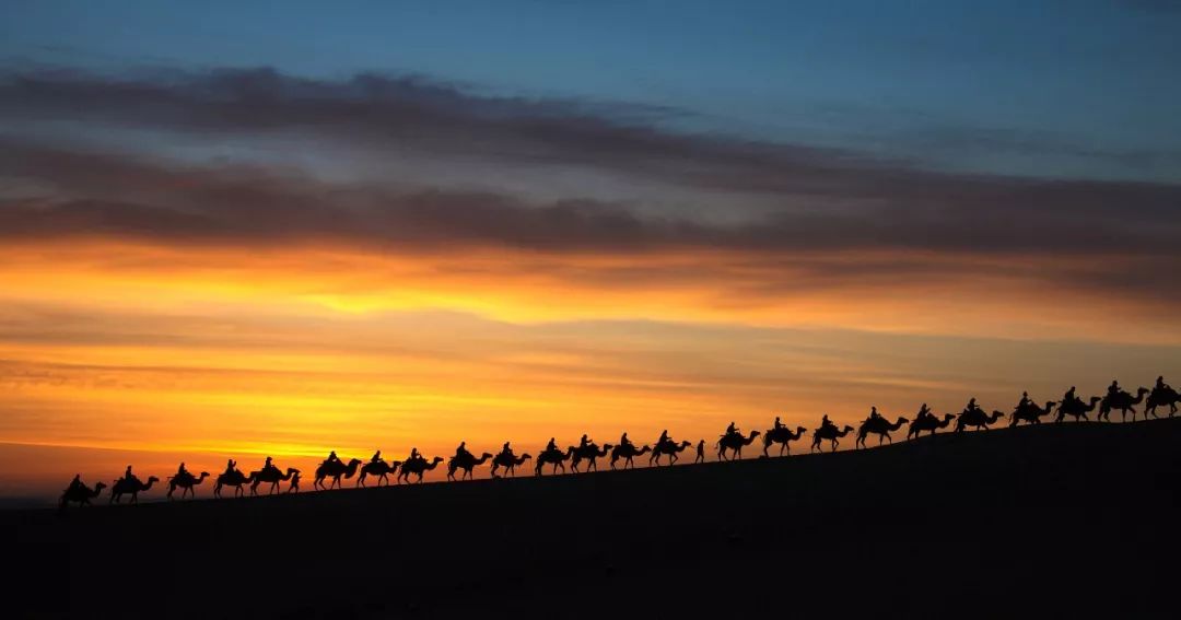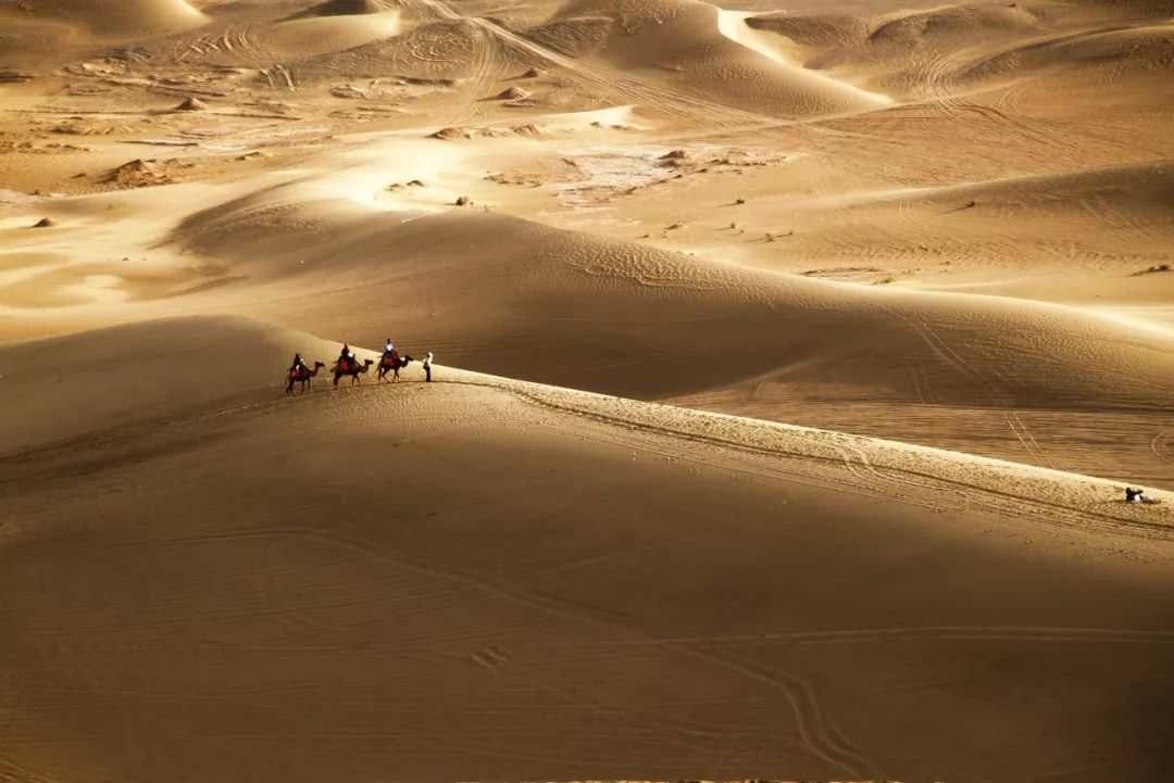▲ 驼队一般会走迎风面和沙脊,它们被风压实,相对好走,背风面沙粒堆积比较松散。图/视觉中国 敦煌,作为丝绸之路上的重要节点,迎来送往无数旅客。他们在沙中跋涉,在水畔休息;有宗教的静心,也有商贸的交易,复又继续启程。而今,络绎不绝的旅客在鸣沙山、月牙泉、月泉阁间穿梭,画面仿佛和历史发生了某种交叠。