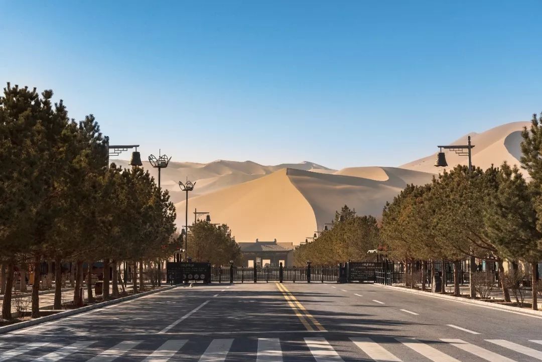 而鸣沙山,就位于东西两个沙漠间的过渡地带,距离敦煌市仅仅只有5公里,时刻标示着这座城市的大漠气质。前凉张骏曾改敦煌郡为沙州,北周保定三年改敦煌县为鸣沙县,皆由鸣沙山得名。故《水经注》云:“(敦煌城) 南七里有鸣沙山,故亦曰沙州也。”