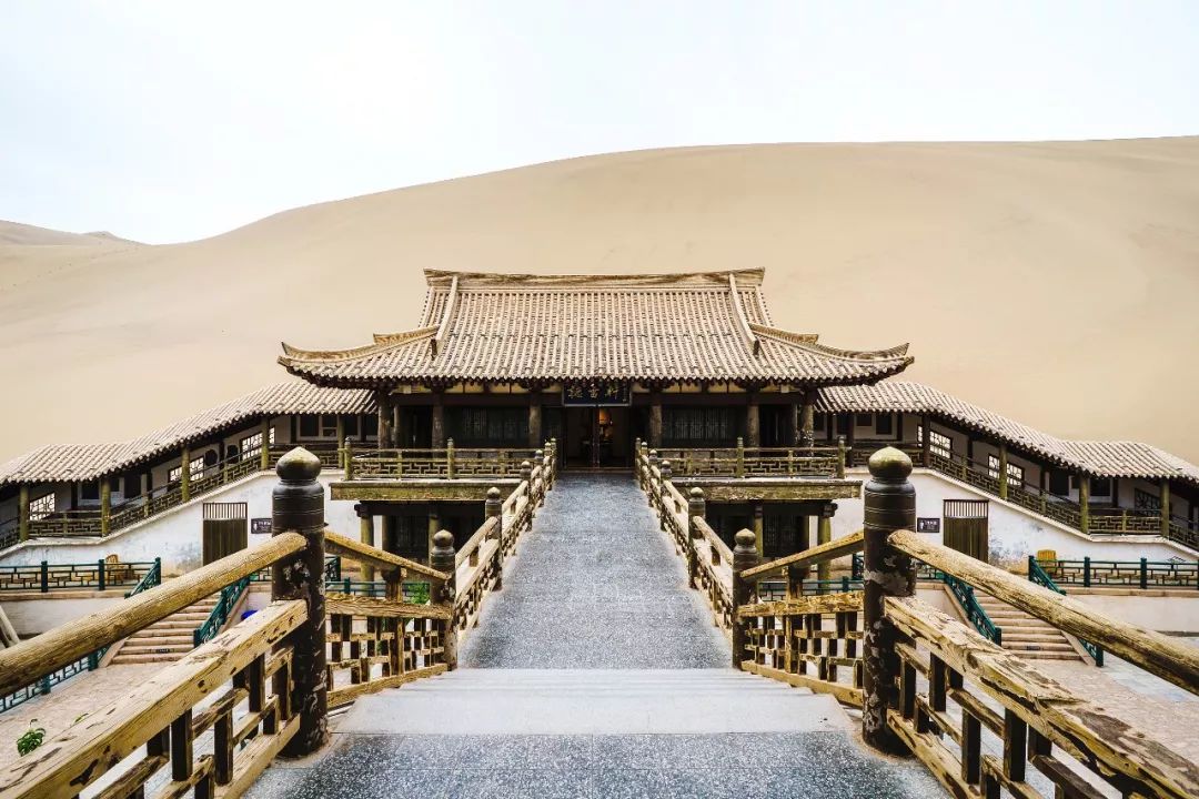 若回到唐宋时期,这里更是盛况空前,西起月牙泉,东至莫高窟,沿鸣沙山北麓塔寺林立,“一里五座庙,三步两道桥”,统称“西天古雷音”;清朝时,这里更是有220多间庙宇,娘娘殿、龙王宫、菩萨殿、药王洞、雷神台……彩塑、壁画、匾额、碑刻样样不少,辉煌不输莫高窟,可惜遗迹多已被磨平。 现在月牙泉边的月泉阁便是在古遗址上重建,尽管新旧有别,但内核与形制仍与敦煌气质有着一脉相承之处。