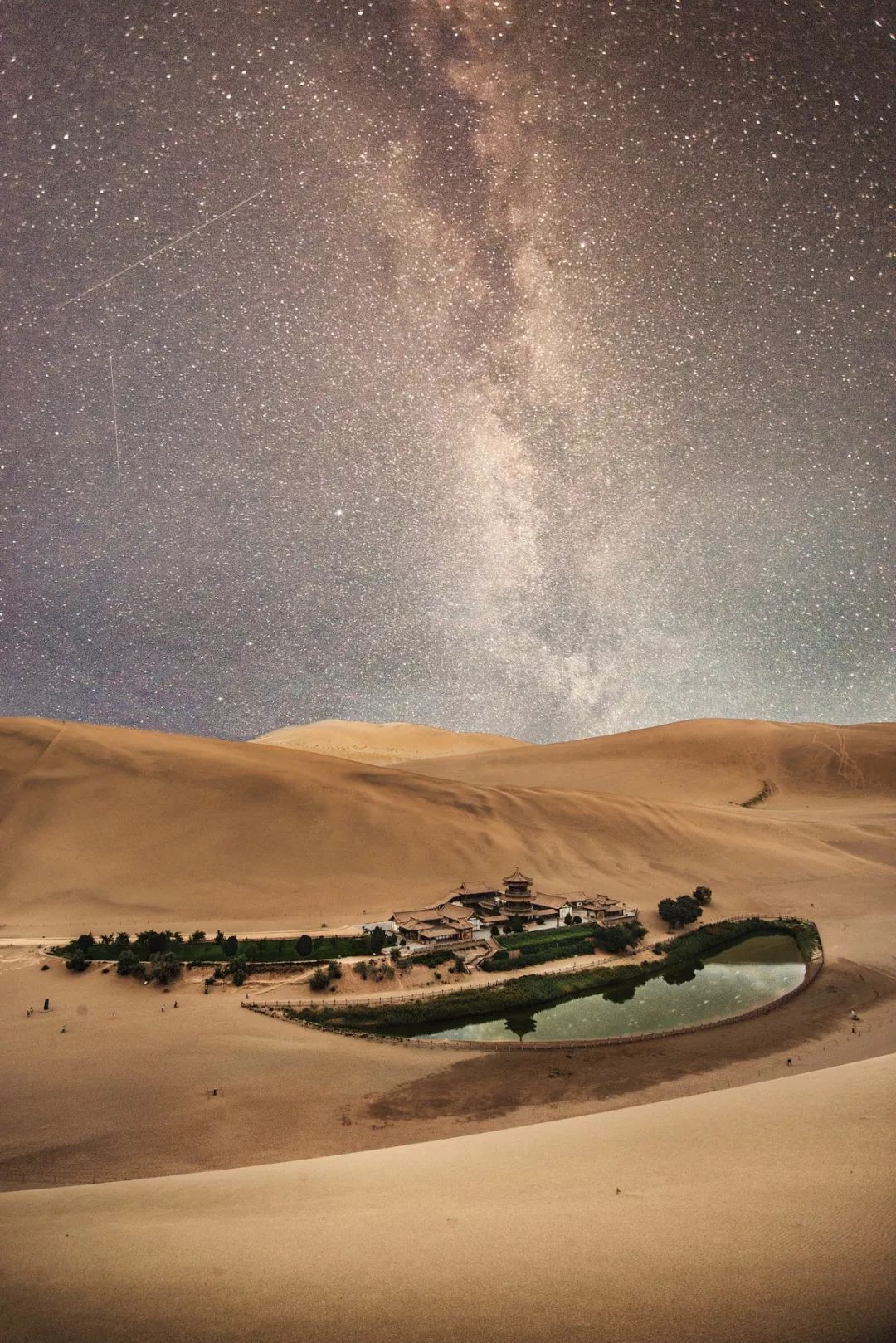 正是水的存在与风的平衡,沙泉在此相拥,敦煌也没有像楼兰那样被吞噬。在这个意义上,鸣沙山与月牙泉,正是大漠与敦煌,有雄浑悠远,亦有温柔清隽,还有在巨大荒芜中一小点异彩的奇迹。