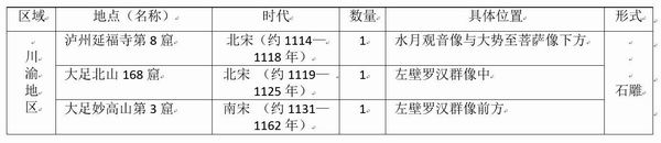 这一地区的玄奘取经图像的共同特点是:一、玄奘取经图像大多雕刻在水月观音龛的右下方,作为附属图像出现;与之相对的左下方多雕大梵天王及其眷属。二、具体来说,玄奘取经图像均为“一僧一从一马”的形式,一字排开,玄奘在前,猴行者多立于马侧牵马,个别在马前;马背均驮经书,书上散发光芒。各处的具体情况石建刚已经撰文作了专门介绍 ,不再赘述。