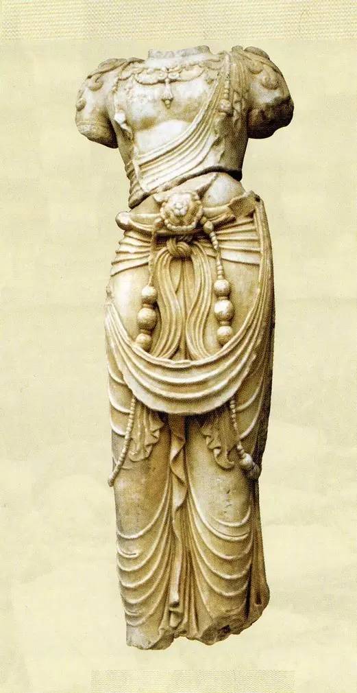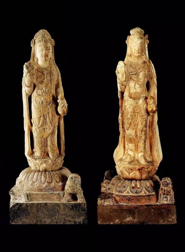 还有一种历史情况,很有意思,值得一提。1992年西安北部汉城乡出土的两尊观音立像,高69.2厘米,现藏西安市博物院。涂金挂彩,至今尚鲜,从风格判断应是北周末到隋初的作品。可注意的是石像台座用的是青灰色的石质,而像身是用汉白玉雕刻的,菩萨立像为两部分组合而成。
