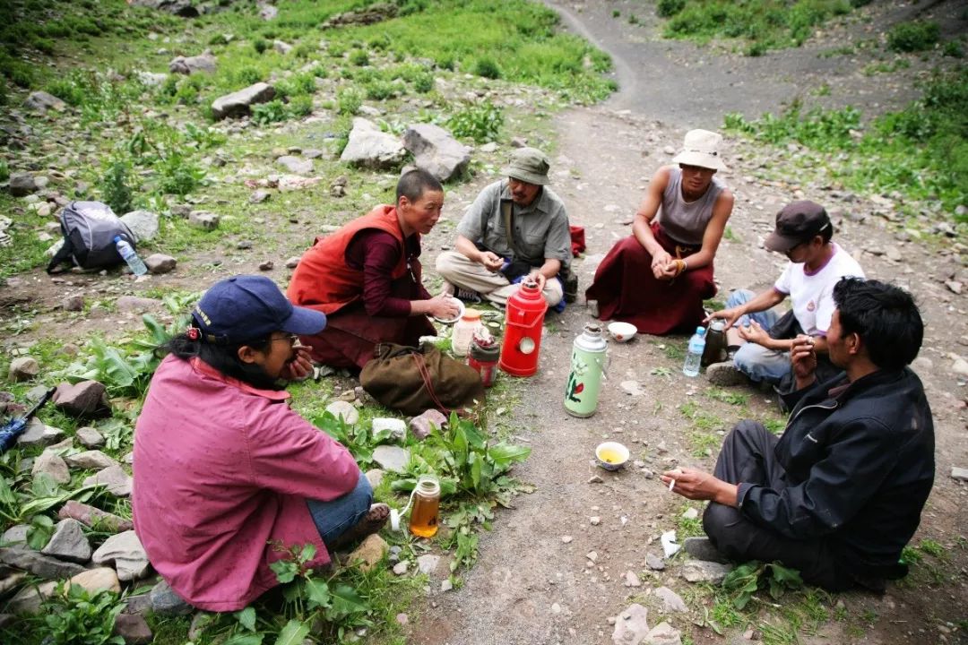 远远见到有人马穿过河谷,寺院里的阿尼啦(修行的女性)拎着茶等在路上。大家围坐,休息一下。