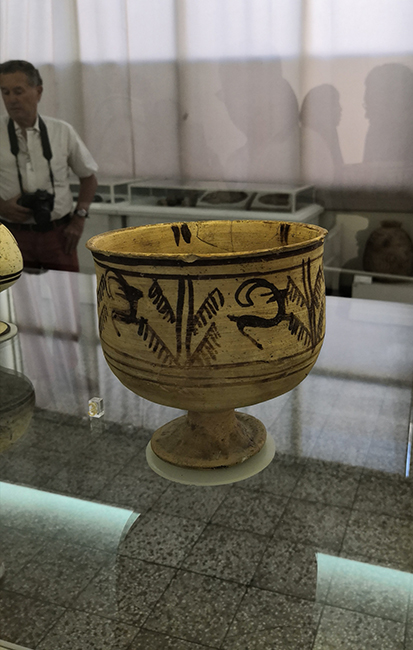 在展厅中有一只陶杯,陶杯上展现了一只山羊要吃一棵树上的叶子而向其移动的五个步骤的连环画,包括攀爬、吃草等的画面。生动显示了古代工匠所展示的颇具社会生活气息的动物饲养的情景。从这些出土的文物中可以看出,在很早以前,伊朗人在制作陶器和铁器等方面已经达到了很高的水平。