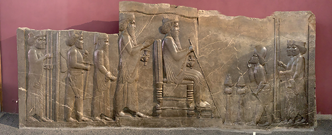 古代伊朗博物馆展品中最为有名的是大流士一世接见使节的石刻浮雕。其描绘的是波斯帝国的阿契美尼德王朝君主大流士一世接见外国使节时的情景。