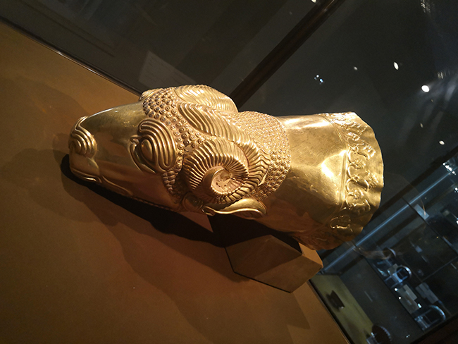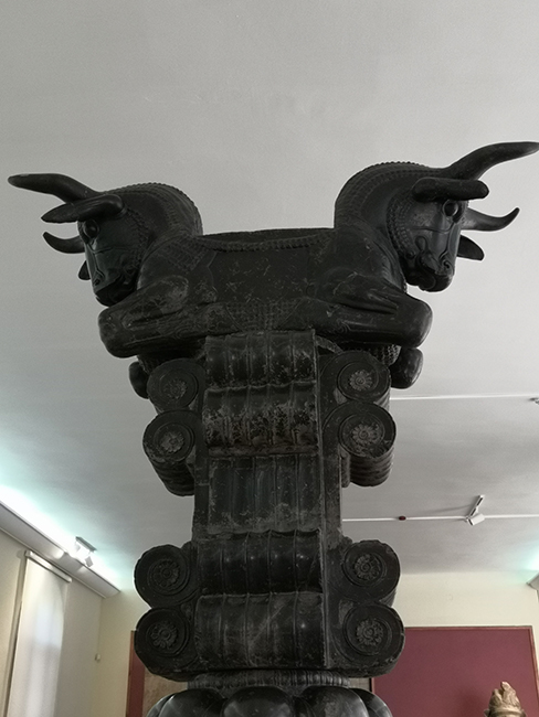馆内不能错过的精品还有波斯波利斯出土的牛首柱头。波斯波利斯是波斯帝国阿契美尼德王朝的一座行宫。这个牛首柱头就是当时波斯波利斯王宫中大型石柱上的柱头。这种柱头大约有36根,散落在世界各地博物馆。