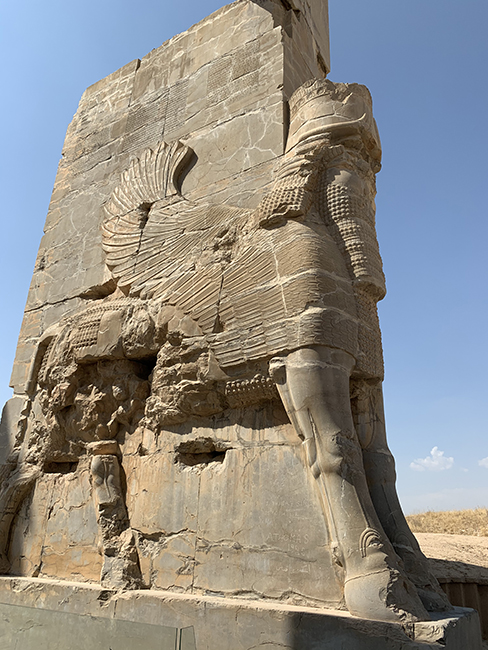 万国门:石阶的尽头是薛西斯一世建造的高25米的四方之门,称“万国之门”(也叫“薛西斯门”或者“波斯门”“万国门”)。它位于宫殿废墟的北面,两座相向的门柱上由两头人头牛身的拉马苏把守。人头牛身的拉马苏,留着长须,经常带有翅膀。城门内两侧各立有几根20多米高的石柱,柱顶同样雕凿着造型怪异的石兽。而穿过门廊回首望去,宫殿东侧同样是高耸壮观的两个门柱。门柱上是两尊集人面、牛身、鹰翅三种形象于一体的石刻像,守护着波斯波利斯。据说,人面、牛身、鹰翅象征着波斯帝国聪明的智慧、强大的国力、丰厚的财富。