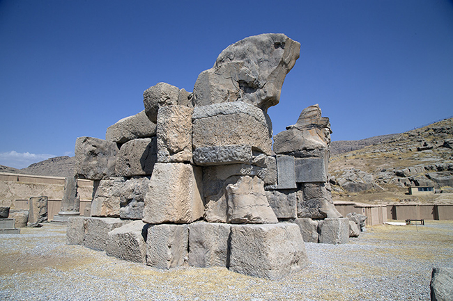 国库:位于遗址的东南区,也叫藏宝区。波斯帝国征战的战利品和四方属国的进贡品都集中在这里。最初由大流士一世所建,以后扩大至两倍,目前仅留下平整的墙基。