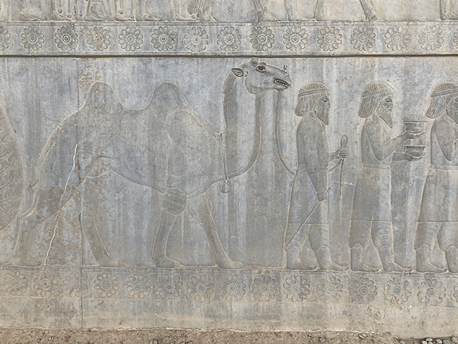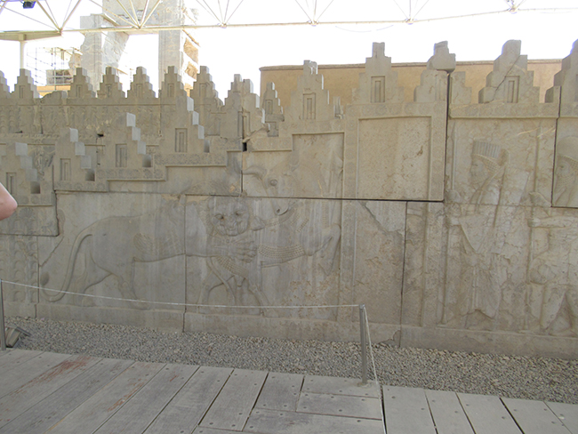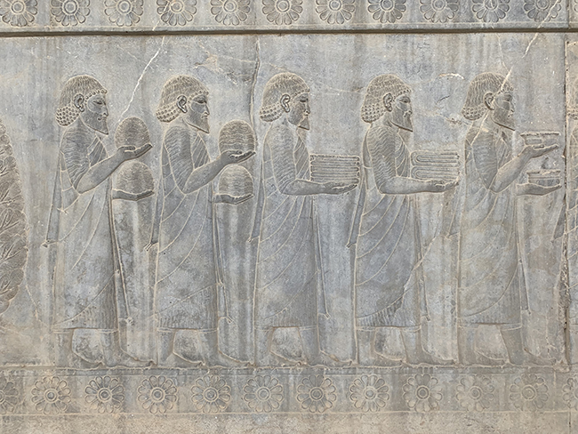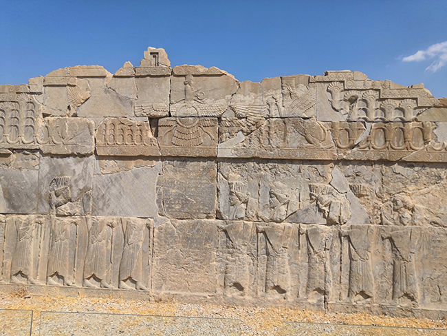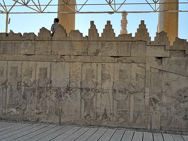 大殿阶梯外侧的墙面中间刻着八名手持长矛的卫士,两端各有狮子与牛搏斗的浮雕。通往觐见大厅的东侧大门南北两侧有阶梯。其中,阶梯的南侧是28个波斯帝国统治下的属国前来进贡的队伍。主要有献上短刀的米底人、赶着骆驼的帕提亚人、带着纺织品和牛的埃及人、献上骏马和双耳瓶的亚美尼亚人、捧着陶器和长袍的巴比伦人、献上黄金的印度人、献上象牙的衣索匹亚人,等等。许多是早已消失的民族,清晰地刻在石墙上。