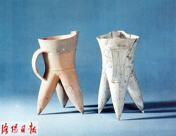 而陶盉,顶部利用流、口和泥钉,做成兽面的样子,颇具艺术性;陶爵一般胎薄体轻,流、尾修长,器壁经反复刮削,腹部刻划纹饰。此外还有一些尊、壶类器具,也做工精致,造型优美。