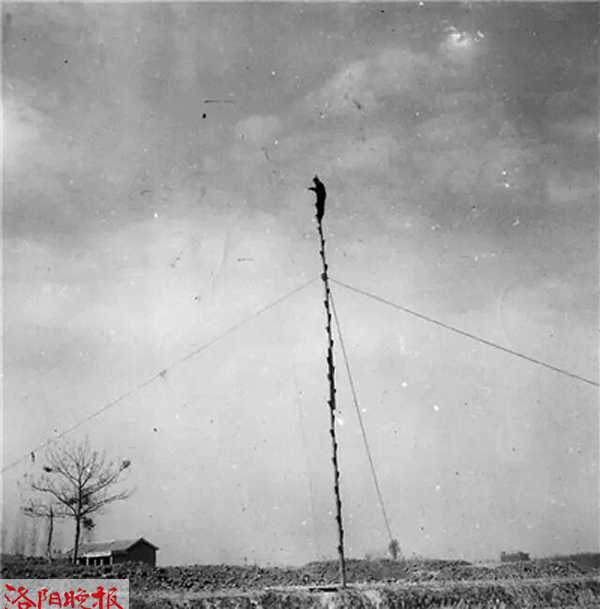 早年拍摄发掘现场照片时需要使用高杆将人架起来(二里头夏都遗址博物馆供图)
