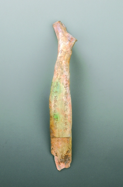 如果说,涂朱涂墨的甲骨并不罕见;那么,在刻痕中镶嵌绿松石的甲骨则异常珍贵,这便是我国博物馆中仅存的一件“宰丰骨匕记事刻辞”。