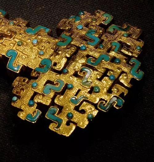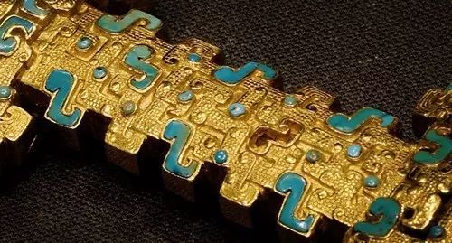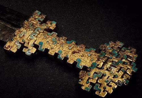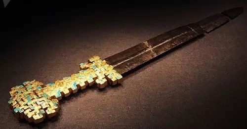 金质剑柄,铁质剑身,金柄作镂空蟠螭纹和饕餮纹,镶嵌绿松石,整个剑柄纹饰繁复,系用失蜡法铸成。