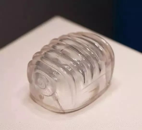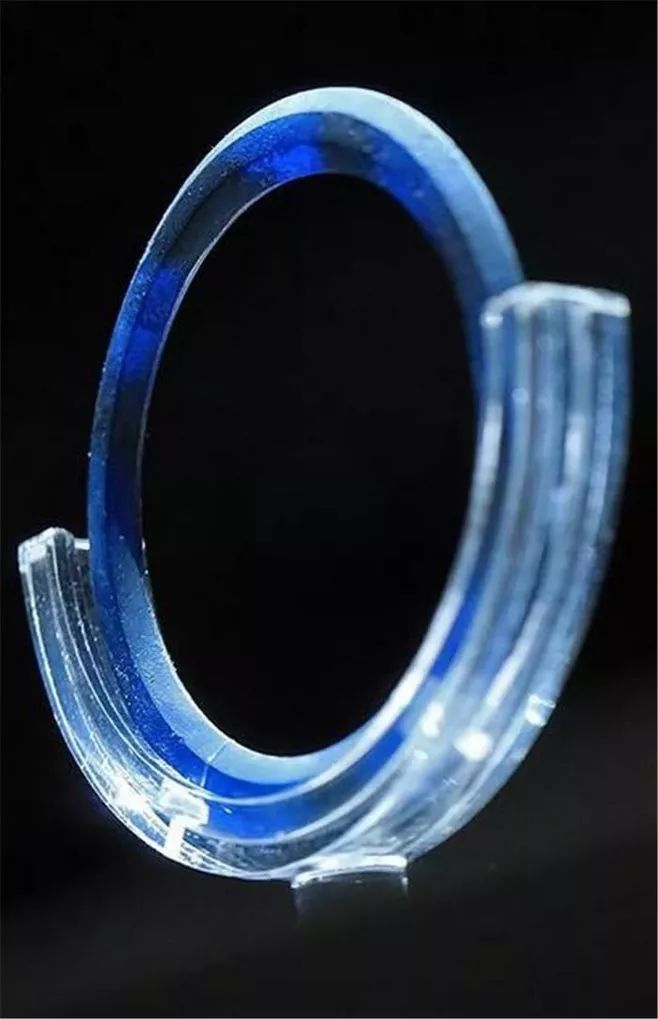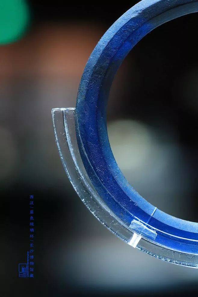 这件文物现藏于长沙博物馆,玻璃质地,透光,素面无纹,表面有黑褐色自然斑块,与自身的深蓝色相映衬,更显高贵神秘、色彩斑斓。