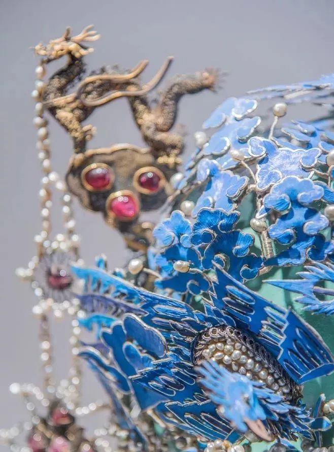 此凤冠通体饰翠鸟羽毛点翠的如意云片,18朵以珍珠、宝石所制的梅花环绕其间。放大看一下: