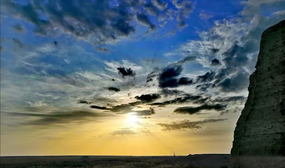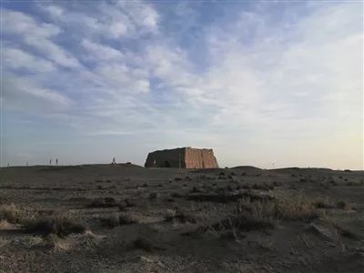 但只需耐心等待数刻,奇迹便会发生。天际忽然泛起隐约的白光,初升的太阳宛如有魔法的火焰一般,点燃了夜空中败絮般灰色的云层,在地平线上腾起青色和赤色的烈焰,护送着朝阳冉冉升上空中,将辉煌的金色恩赐给广袤辽阔的戈壁。终于,可以看到玉门关遗址浮现在道路的尽头。尽管那只是一个青黛色的小方块,但也能让人蓦然升起一种强烈的怀古之情。