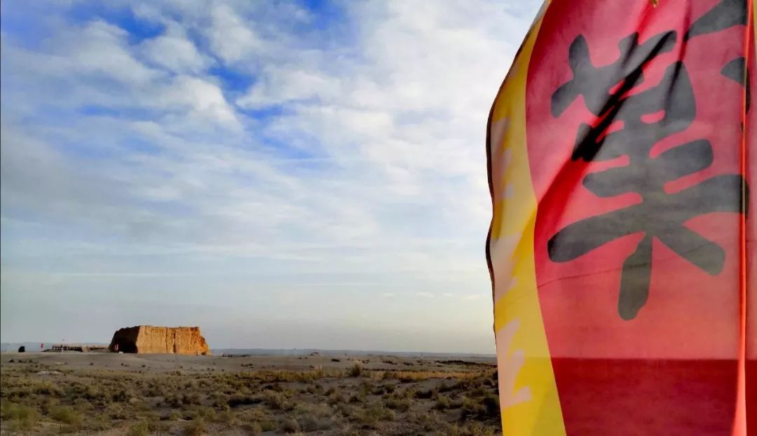 通往玉门关小方盘城遗址的路上到处插满了汉字旗。
