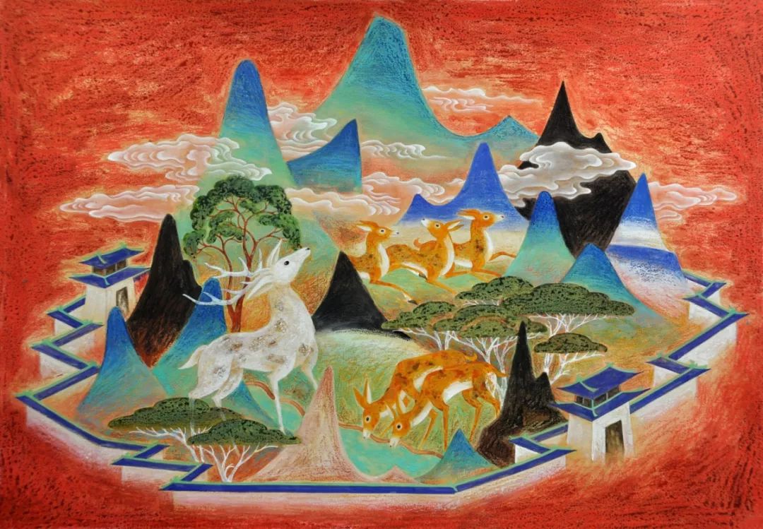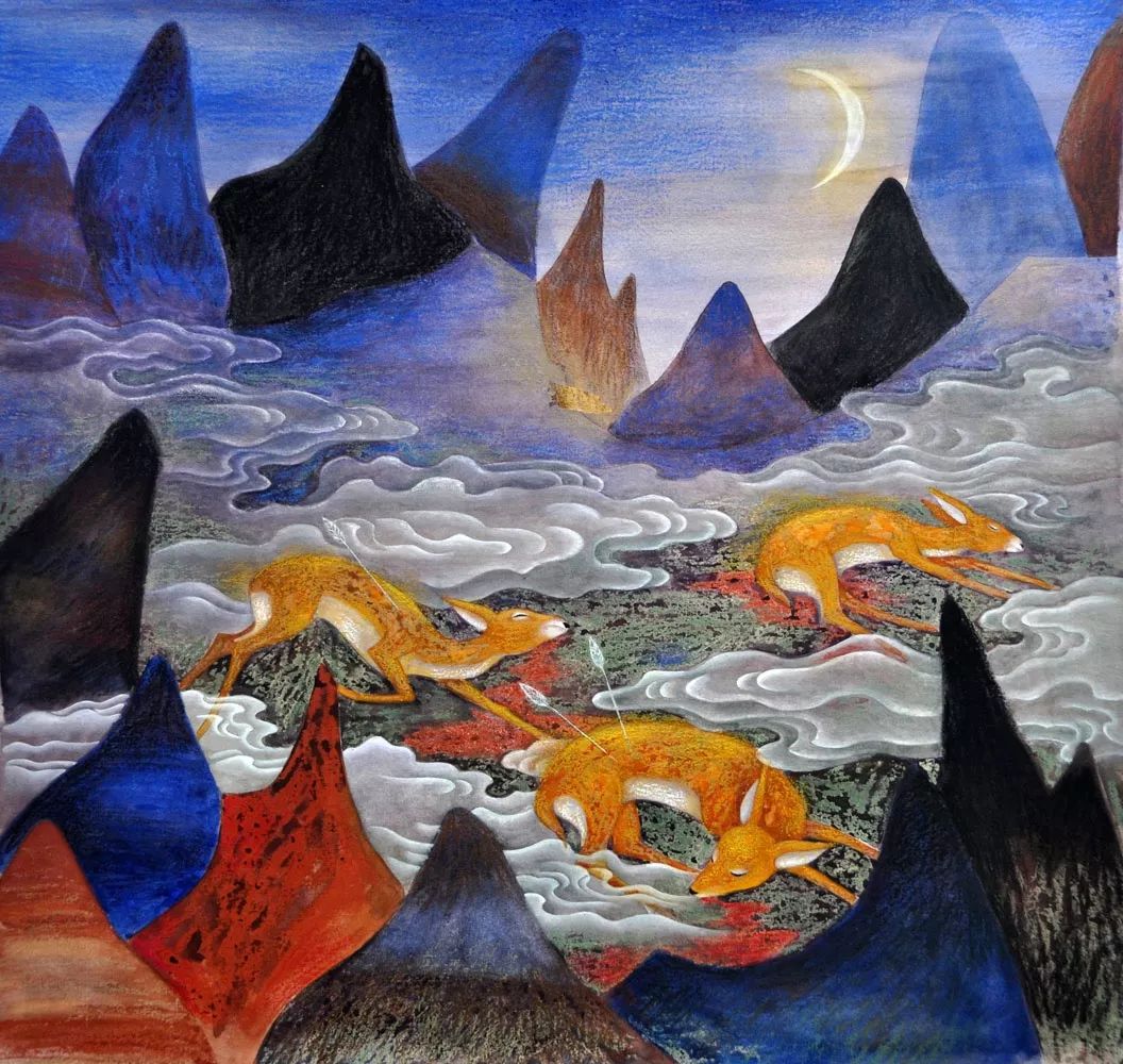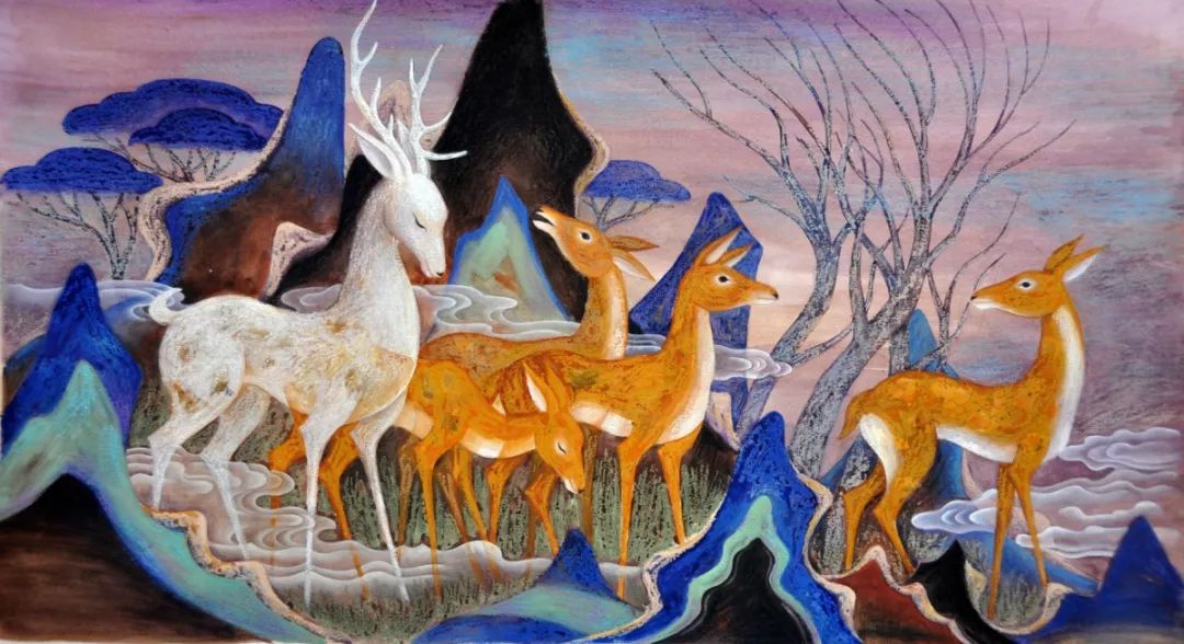 敦煌艺术是我国乃至世界艺术的一大宝库,对于敦煌艺术的学习,不仅仅是继承,更要发掘其优秀的形式与内涵,为当今的时代服务。在敦煌壁画中,佛传故事,经变图和尊像图占据了主要的篇幅,尤其是佛传故事图,由于其内容丰富,可以说是敦煌艺术留给我们的一大宝贵资源。从犍陀罗时期就盛行的佛传图,大多以连环画的形式,表述佛经的内容,由于图像的直观,历来为佛教的传播发挥了重要的作用。敦煌丰富的佛传故事图,正可以为我们今天佛法的弘扬再度发挥力量。当然,这需要当代艺术家的努力,借助敦煌原本的图像内容和形式,创作出令现代人更容易接受的作品。信东居士这组《鹿王本生》故事图,我是在微信群中偶然发现的,给人耳目一新的感觉,作品利用了敦煌壁画的色彩和造型,但创作形式中又不乏现代因素,十分适宜现今读图时代的观者。经与作者协商,将这组作品在旃檀精舍平台刊登,以飨读者。