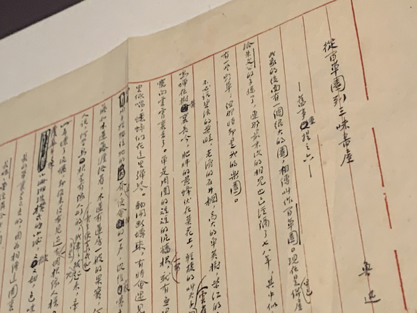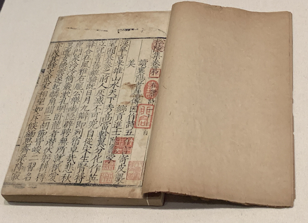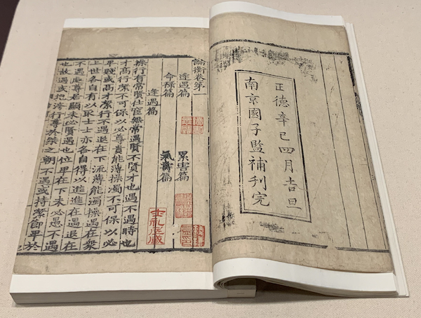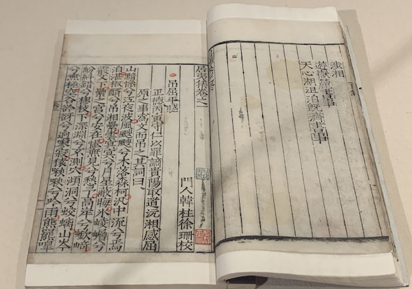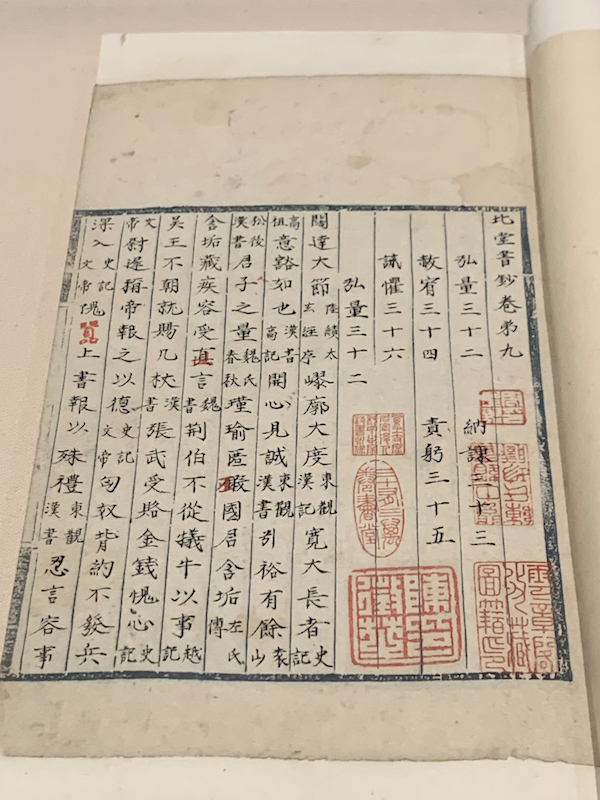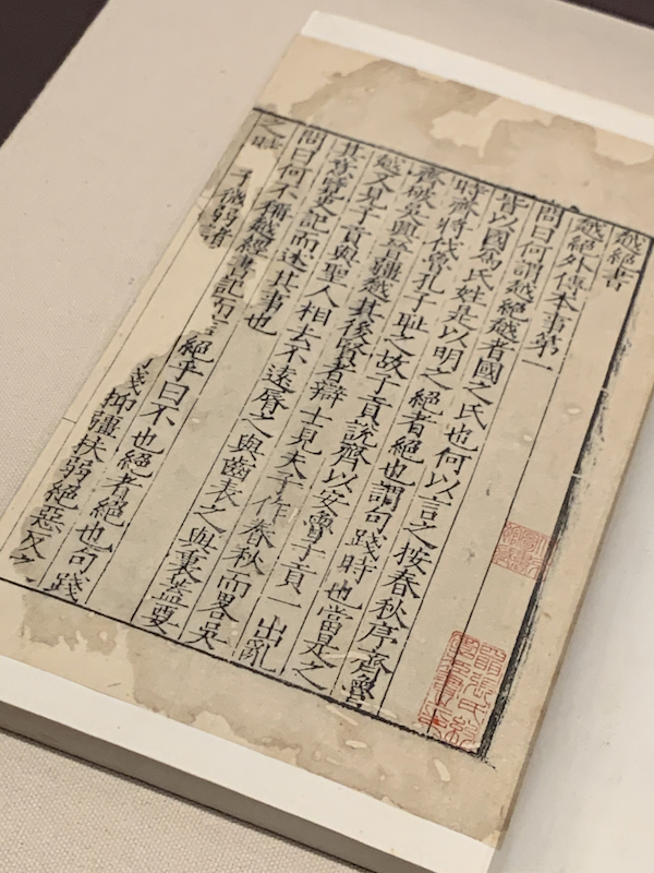 这卷宋本《论衡》是整个展厅中年代最久远的古籍。为宋乾道三年(1167年)绍兴府刻宋元明递修本,该宋刻本经元代补刻,明代又修过,保留了三个朝代的痕迹。上面有钱谦益的印章,卷末有元韩性跋、清黄丕烈跋。