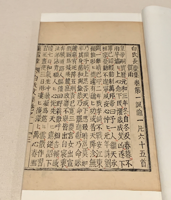 《白氏长庆集七十一卷》 白居易撰,明正德八年,华坚兰雪堂铜活字印本。序文尚有“扬、越间多作书模勒乐天及予杂诗,卖于市肆之中也”之记载,是迄今所见最早记录越地刻书的珍贵文献。白集宋代时多有刊刻,明正德年间无锡华氏以铜活字摆印,保留宋本旧貌。