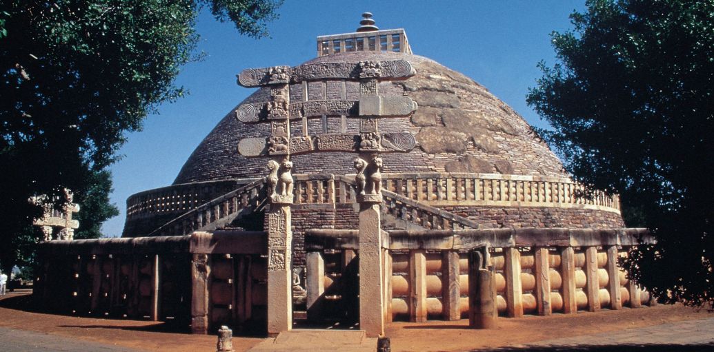 桑奇大塔(1号塔、北门)前公元3-公元1世纪初相传在公元前3世纪,阿育王皈依佛教后,开取最早的八座佛塔当中的七座,把其中的舍利取了出来,敕建了八万四千佛塔。当然“八万四千”是一个形容词,形容建造了很多佛塔。此后直到12世纪末,佛教在印度本土衰亡为止,印度人建造佛塔的活动一直没有中断,因此今天我们在印度可以看到各个时期的、各种各样的佛塔。