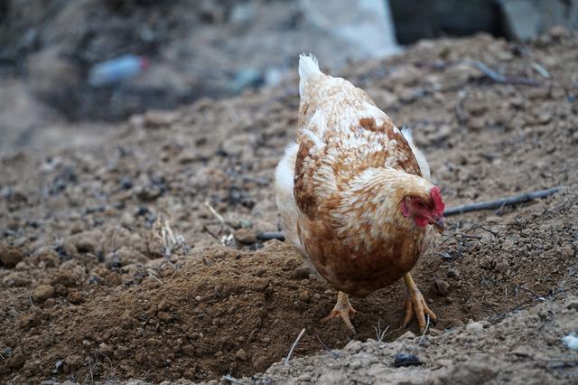 一只小母鸡在窑洞前刨食,时不时舒服地咕咕两声