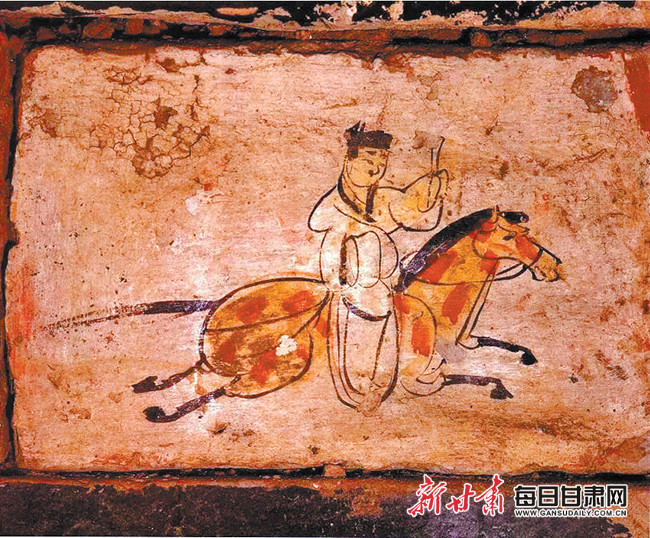 砖面以白粉涂底,墨线勾勒,红黑色敷彩。画面正中绘一信使,头戴黑帻,着皂缘领袖中衣,左手持棨传文书,跃马疾驰。马身涂黄色,上有红色的斑块,四足腾空,长尾平甩。