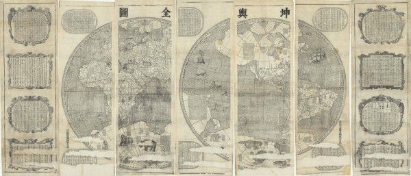 清代传教士南怀仁刻《坤舆全图》时仍沿袭利玛窦旧例,制成屏风状