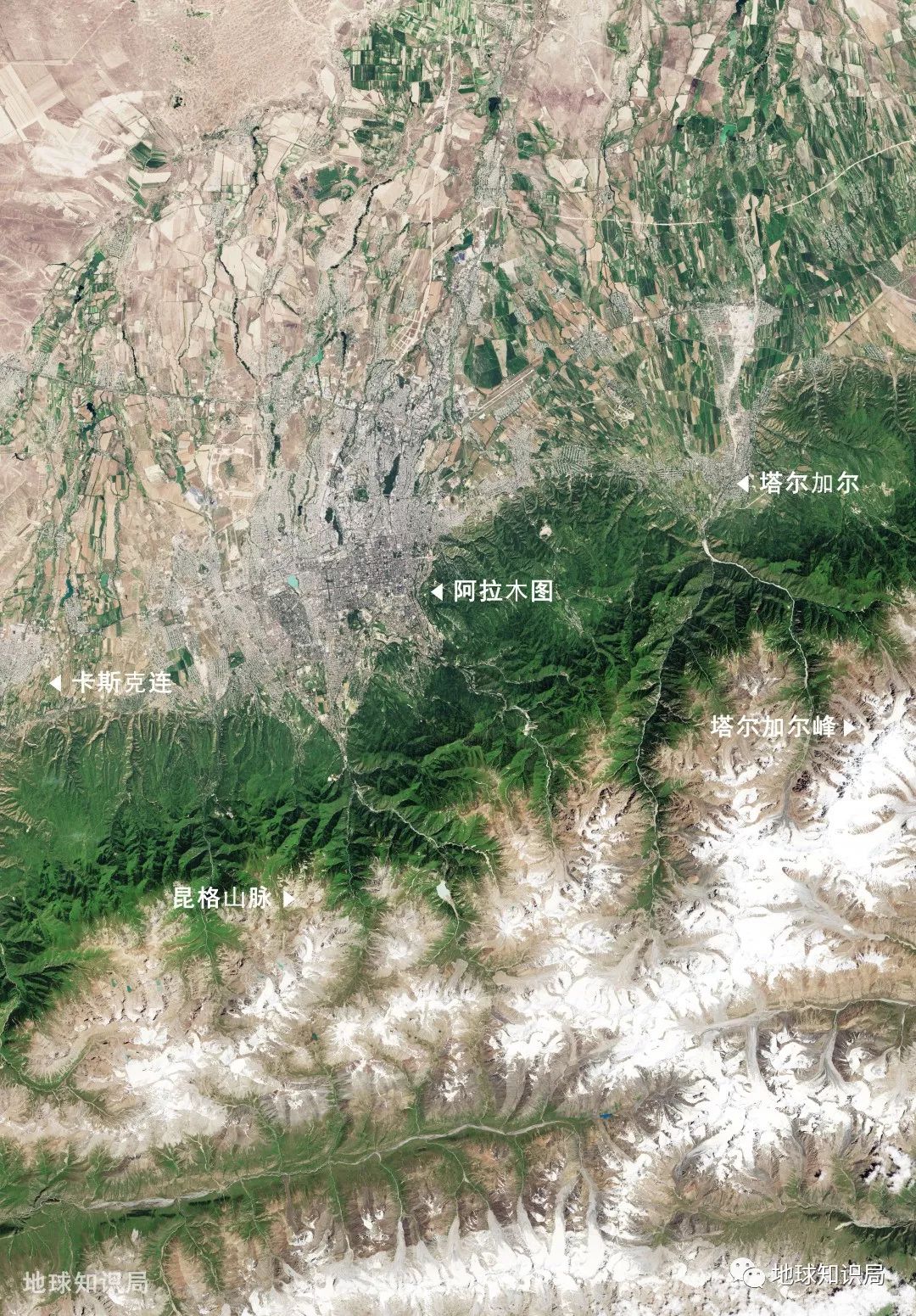 昆格山脉山脚下的阿拉木图与周边城市