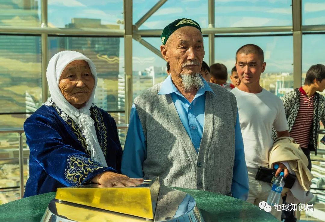 比如被称为“生命之树”的巴伊杰列克观景塔,造型是树杈间的一颗金蛋,典出哈萨克神话里喜欢产卵的一只神鸟。登上高塔的游客可以看到首都全景(也包括建成区外突然出现的一望无际的草原),还能看到纳扎尔巴耶夫的镀金大手印,据说可以摁在手印上许愿。
