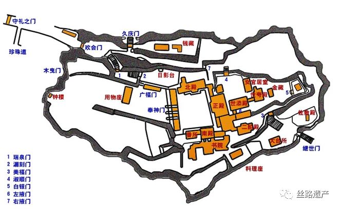 外廓有欢会门、继世门、久庆门、栧门四座城门,内廓有瑞泉门、漏刻门、广福门、左掖门、右掖门、淑顺门、美福门、白银门等多座城门。